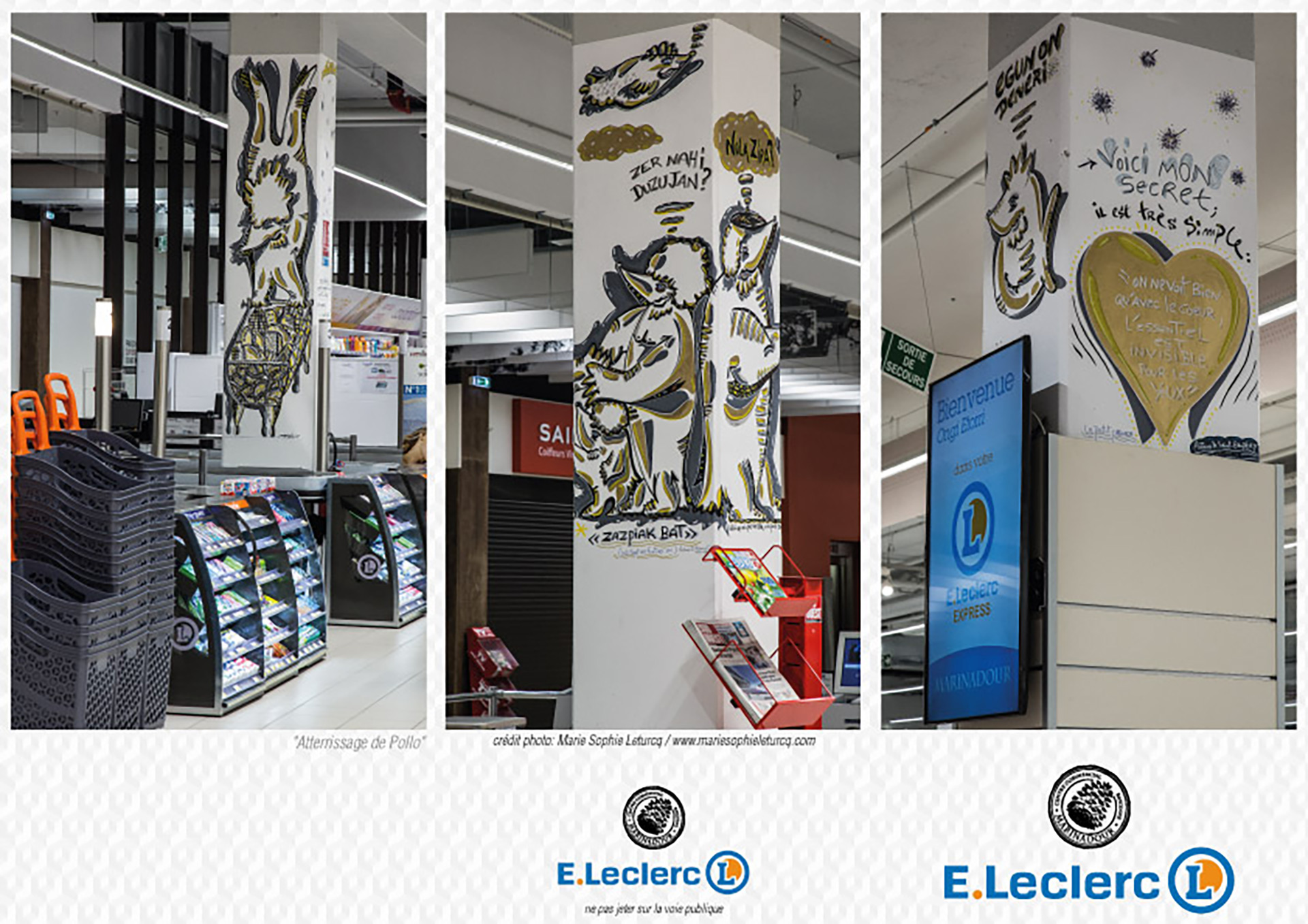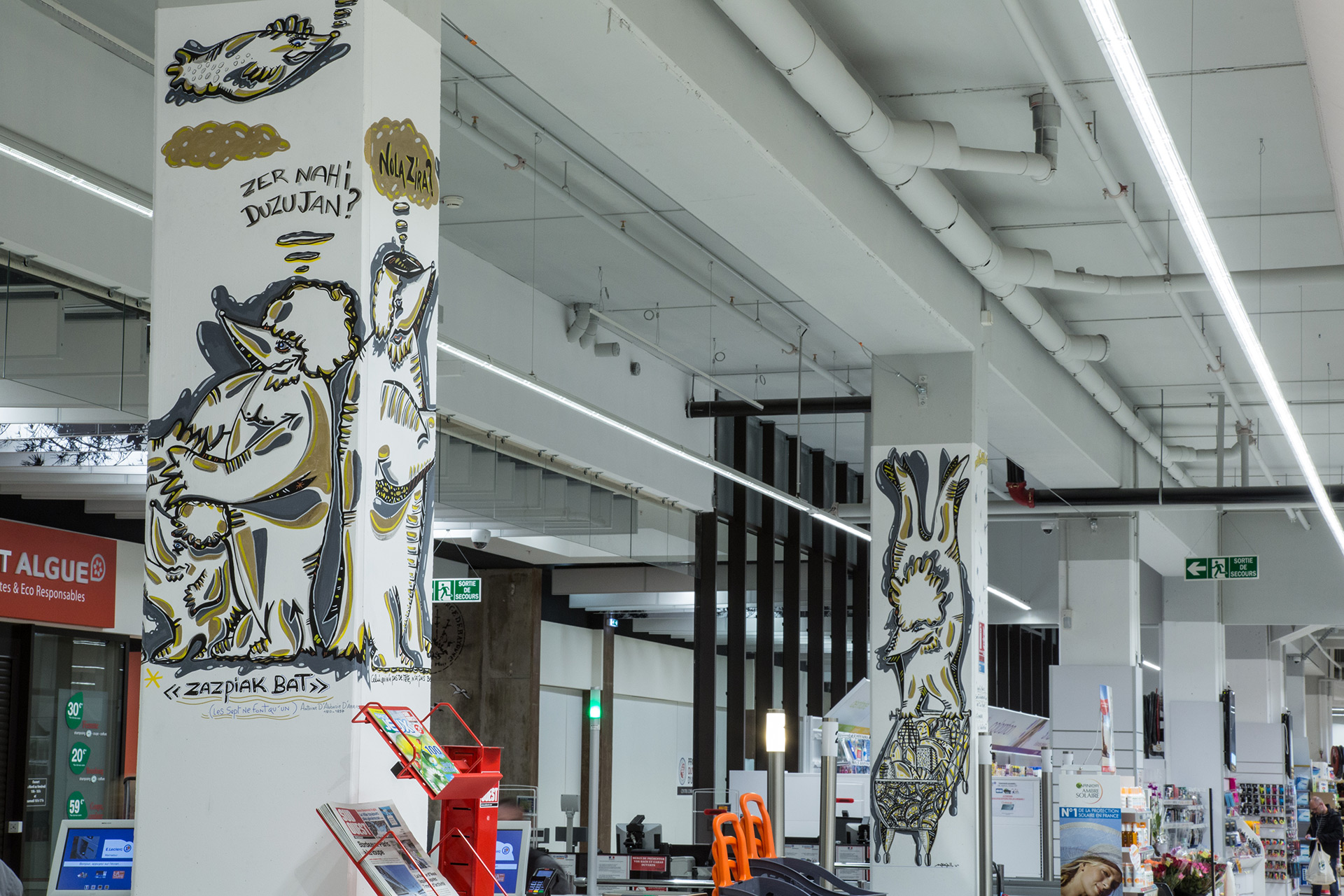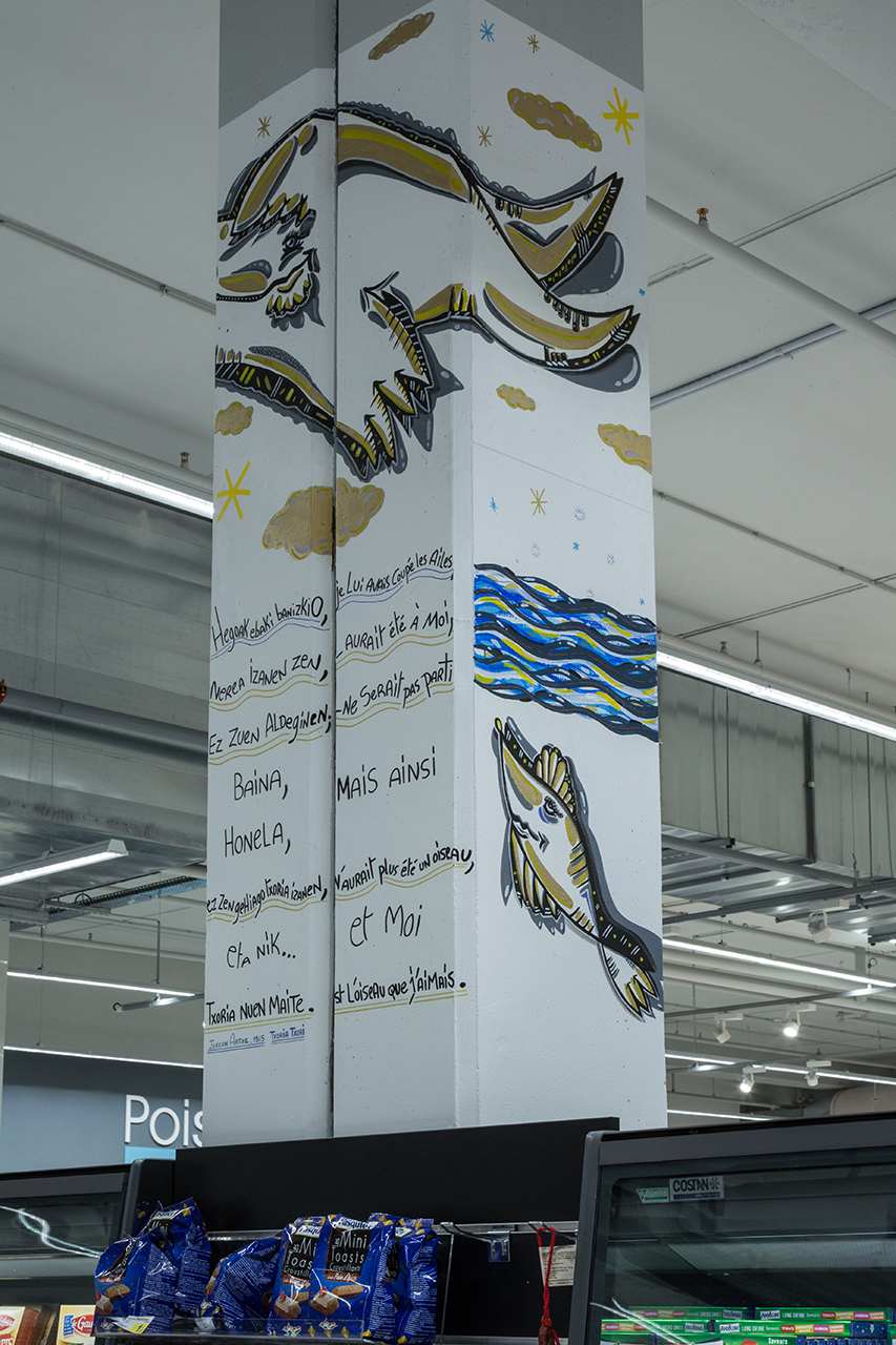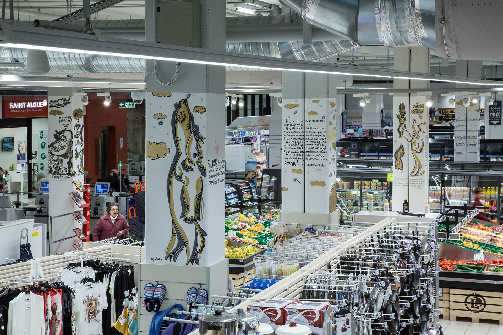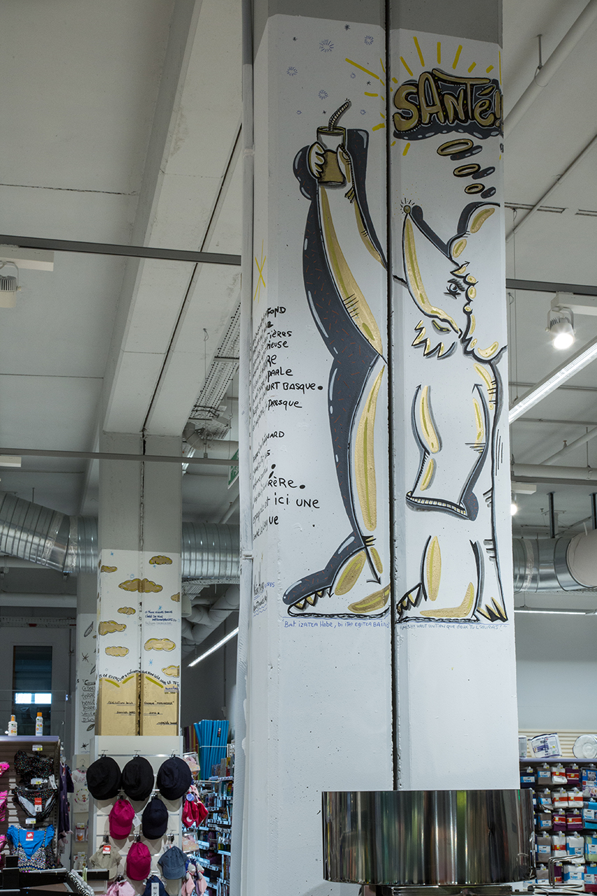 J’ai fait appel à divers personnalités et j’ai écrit leurs pensées avec d’autres auteurs disparus pour créer une narration dans ce lieu permettant de voir des choses inhabituelles en faisant ses courses. Mon commanditaire m’a proposé de faire également une exposition dans le centre commercial suite à la commande réaliser quelques mois plus tôt aux Arènes de Bayonne.