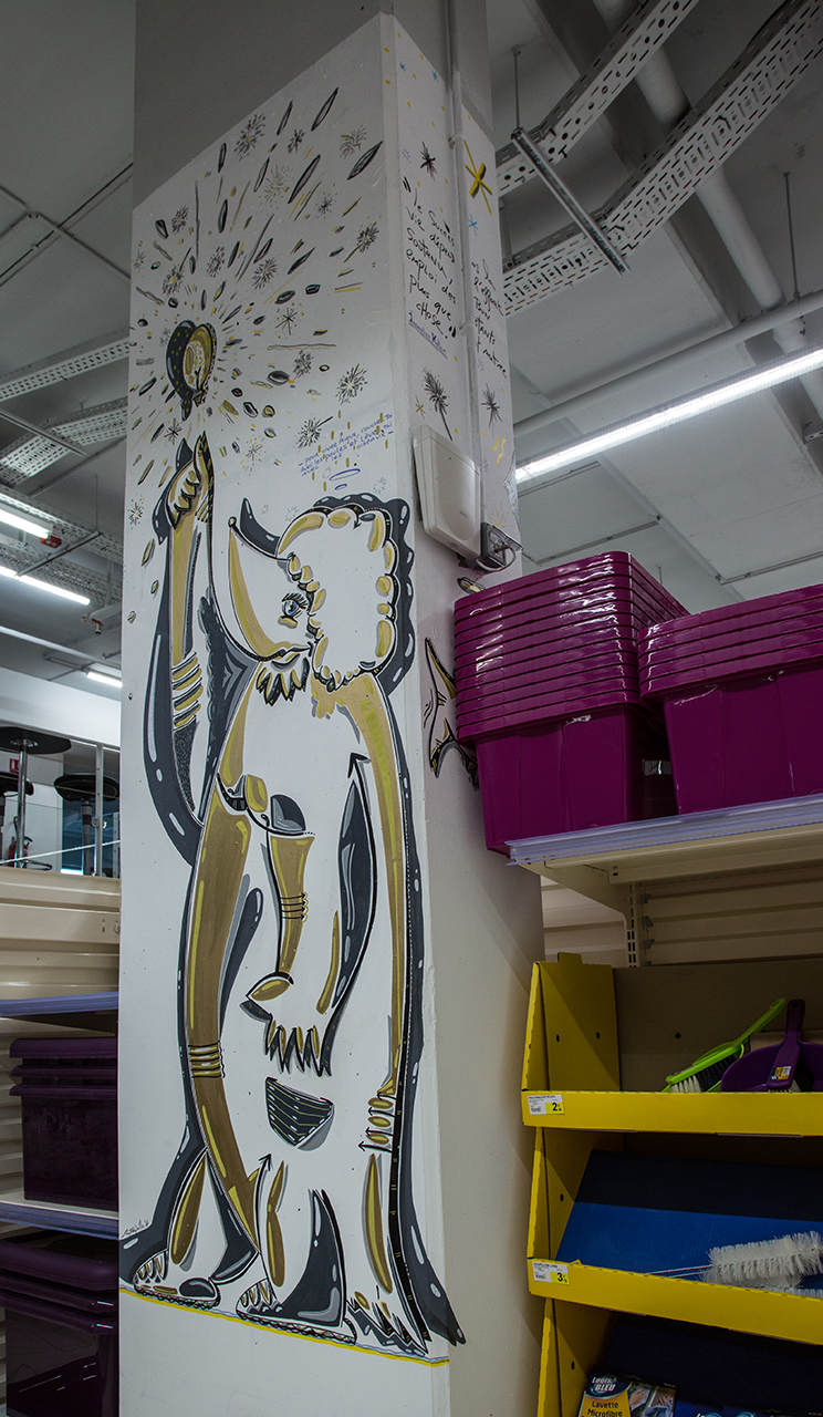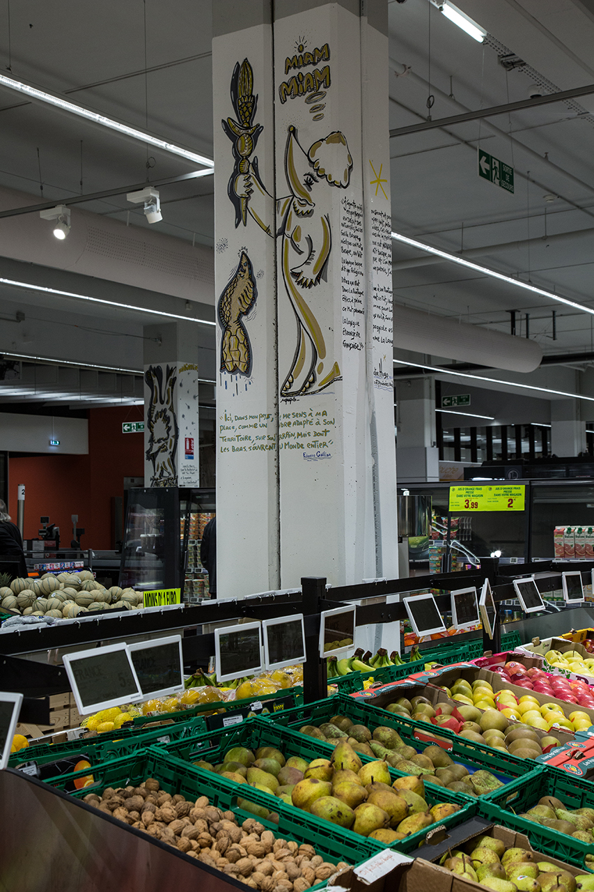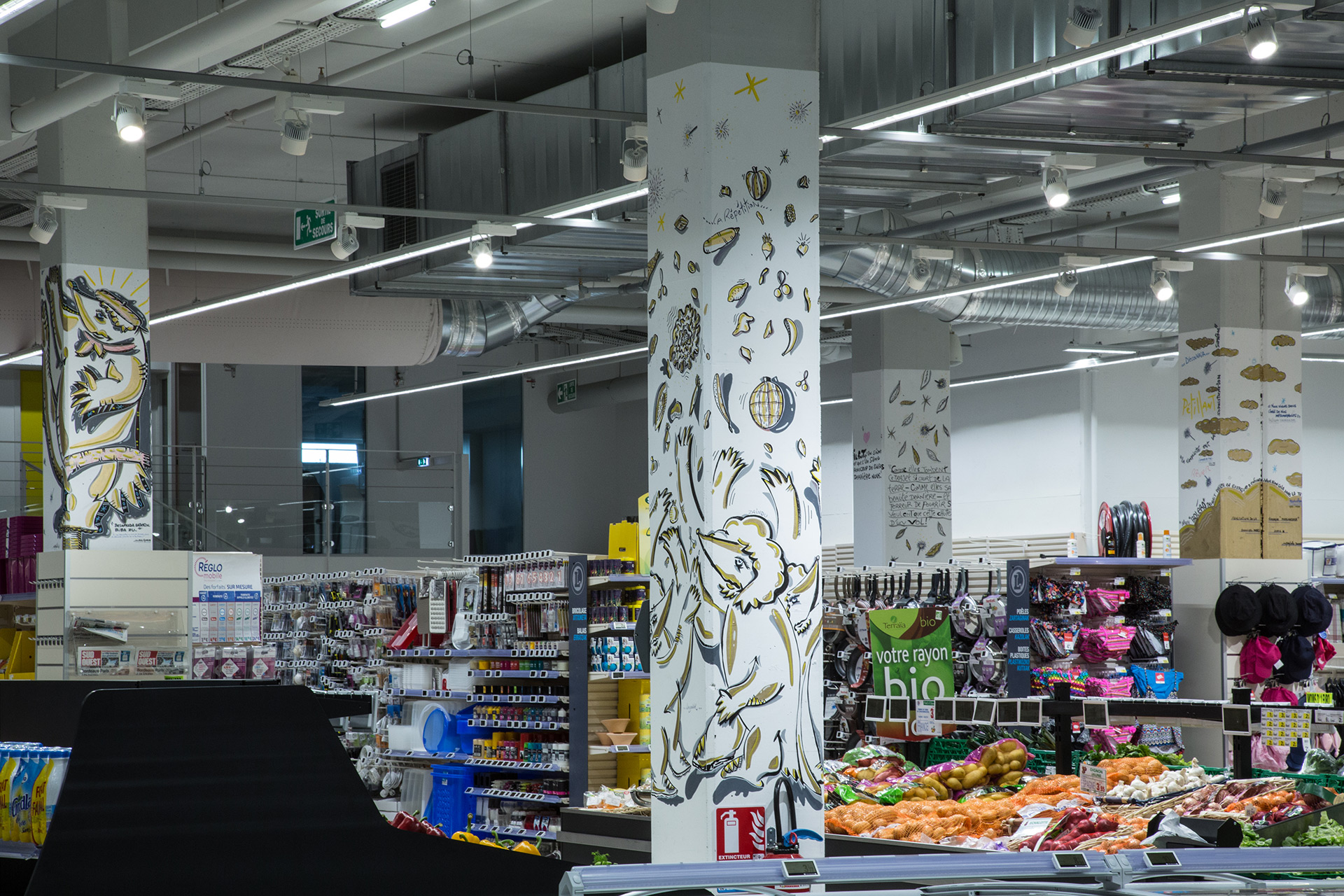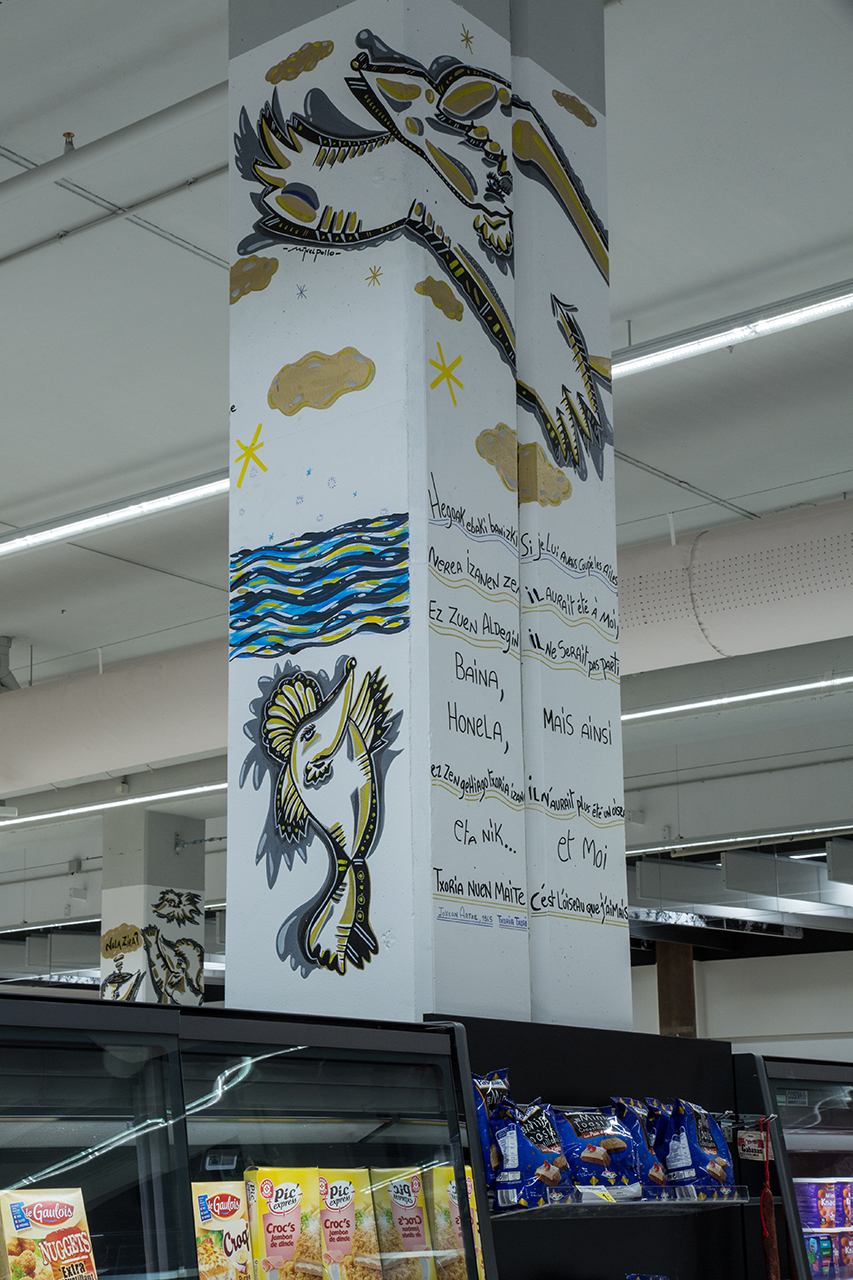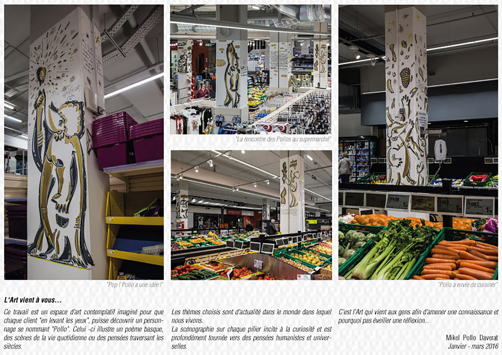 J’ai fait appel à divers personnalités et j’ai écrit leurs pensées avec d’autres auteurs disparus pour créer une narration dans ce lieu permettant de voir des choses inhabituelles en faisant ses courses. Mon commanditaire m’a proposé de faire également une exposition dans le centre commercial suite à la commande réaliser quelques mois plus tôt aux Arènes de Bayonne.