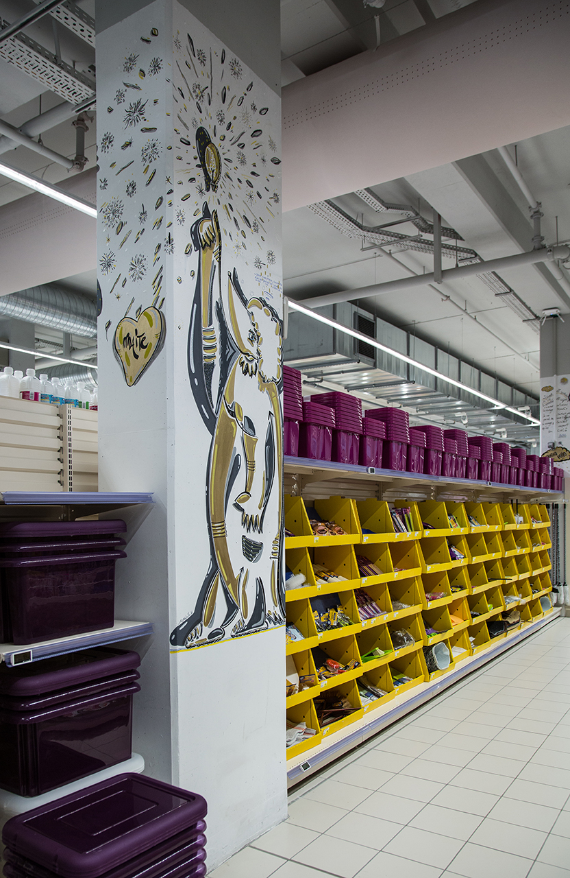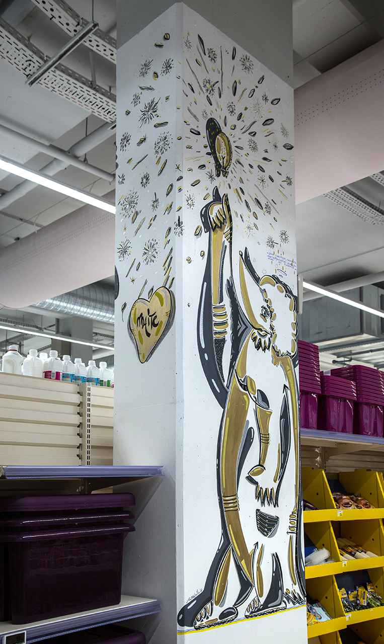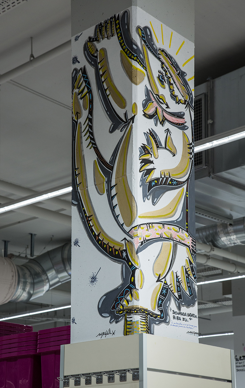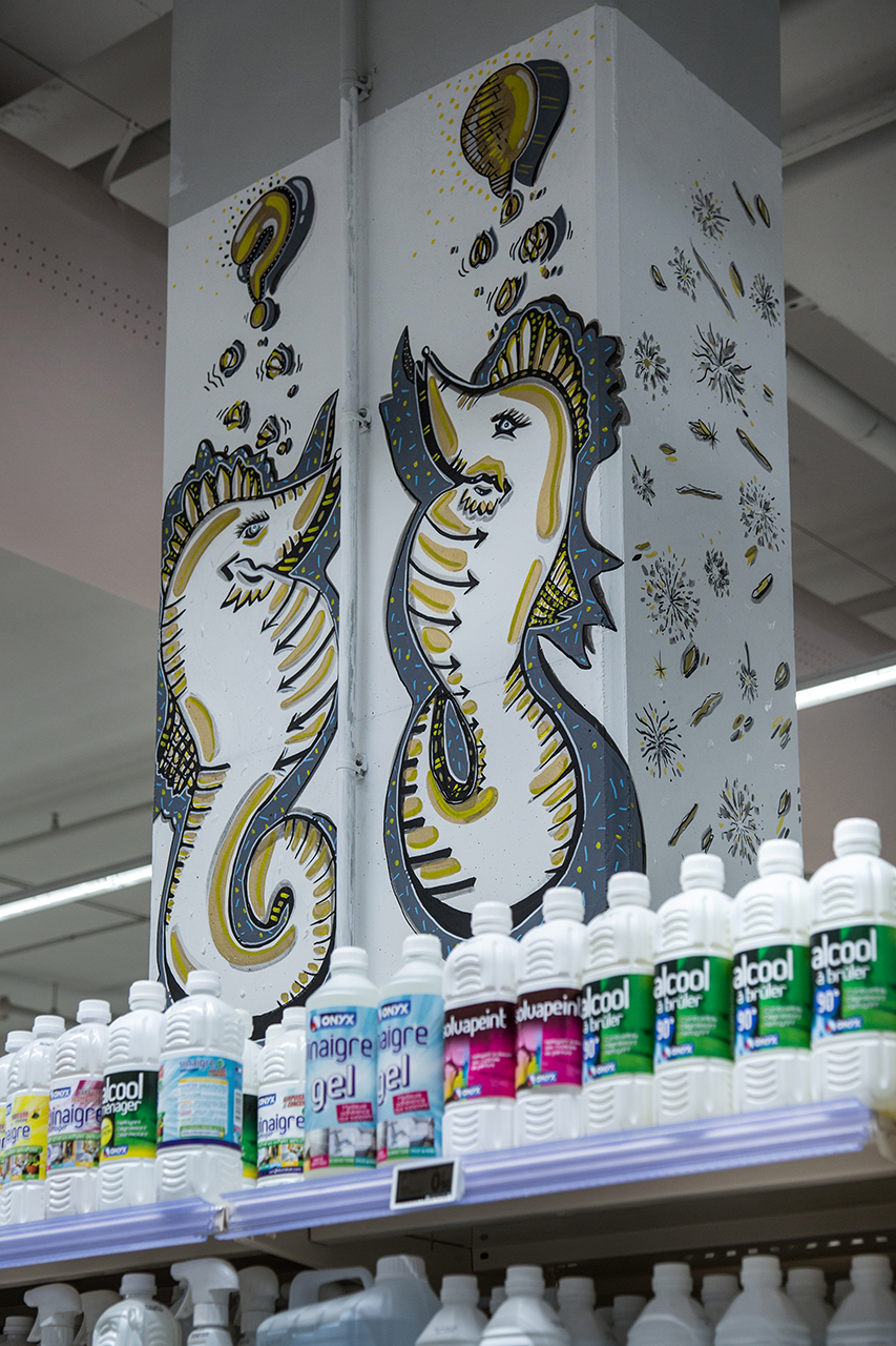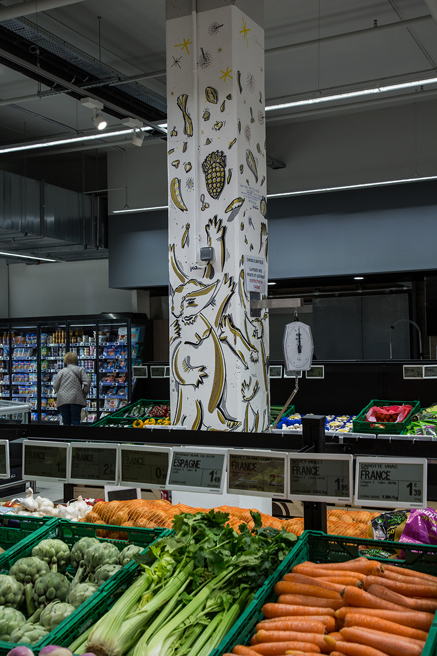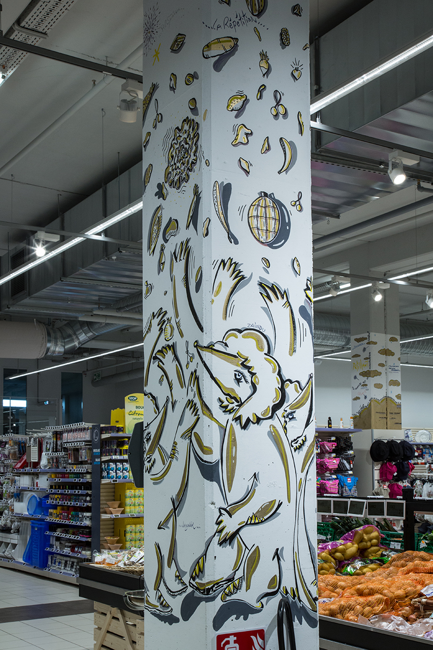 J’ai fait appel à divers personnalités et j’ai écrit leurs pensées avec d’autres auteurs disparus pour créer une narration dans ce lieu permettant de voir des choses inhabituelles en faisant ses courses. Mon commanditaire m’a proposé de faire également une exposition dans le centre commercial suite à la commande réaliser quelques mois plus tôt aux Arènes de Bayonne.